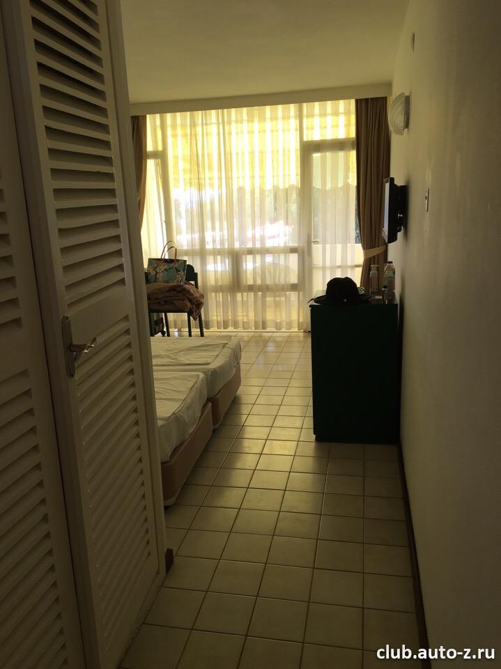 номер в отеле очень простой и обычный: ванна, гардероб (на фото он слева), пару тумбочек, телевизор не большой, две кровати (кстати мы их соединяли, тк нет двойных в отеле, это наверное, единственный минус), балкон с отличным видом на море и территорию, шкафчик. убираются каждый день. номера всегда чистые!